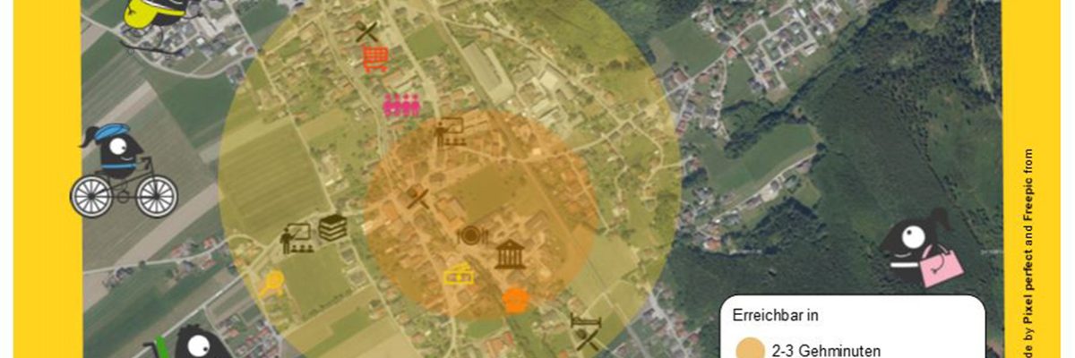In der Karte finden Sie dazu als Beispiel in gelb eingezeichnet den Umkreis welchen Sie zu Fuß in 8-10 Gehminuten erreichen – der orange Bereich kann innerhalb 2-3 Minuten zurückgelegt werden und mit dem Rad natürlich alles noch um ein vielfaches schneller.