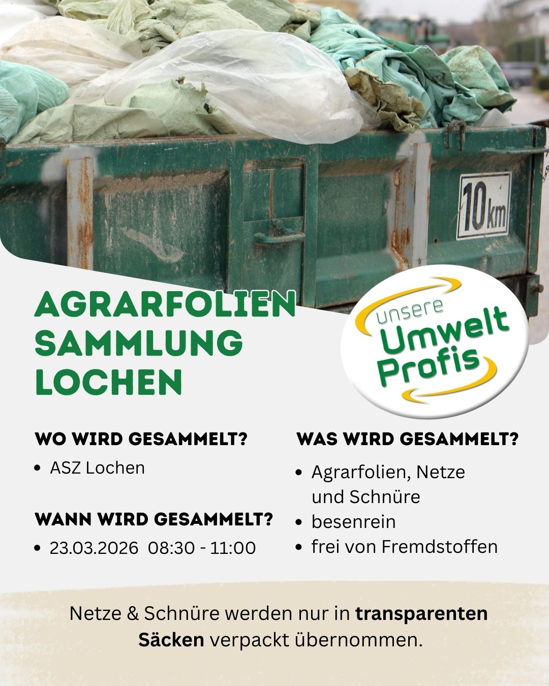 Die Agrarfoliensammlungen finden zweimal jährlich, jeweils im Frühjahr und im Herbst, statt. Zusätzlich wird im Sommer eine eigene Sammlung für Netze und Schnüre angeboten.