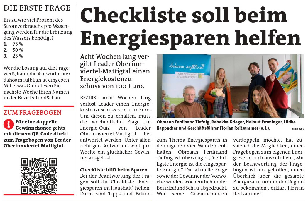 Nimm an dem „Energie-Quiz“ in der BezirkRundSchau teil und sichere dir 100 Euro. Um die Gewinnchance zu erhöhen kann zusätzlich pro Haushalt der Energiesparfragebogen abgegeben werden. Für die Teilnahme wird der Name sowie die Mailadresse oder Telefonnummer benötigt. (Teilnahme erst ab 18 Jahren möglich), https://www.umfrageonline.com/c/Energiecheck.