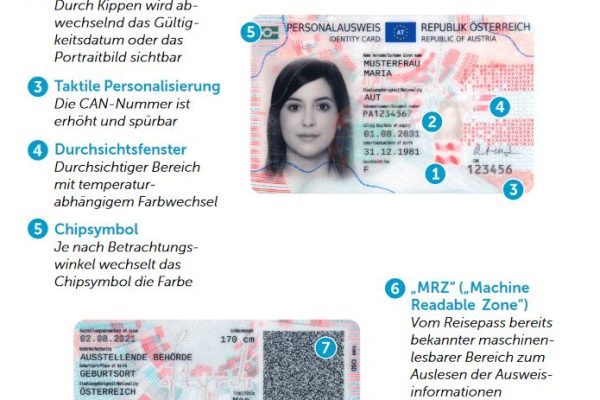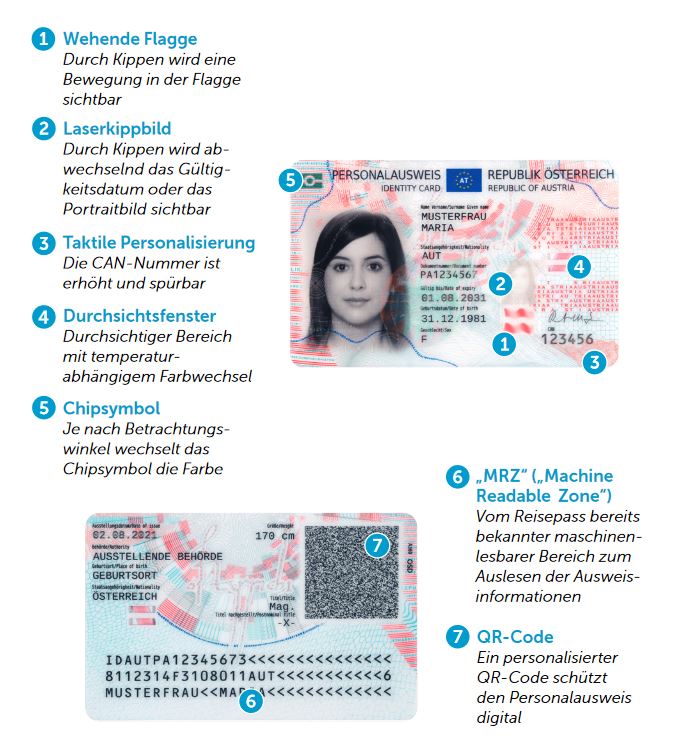 Seit 2. August 2021 kann der neue Personalausweis in Österreich beantragt werden. Wie bereits vom Reisepass bekannt, kommt der neue Personalausweis nun mit Chip, auf dem die biometrischen Daten gespeichert sind (u.a. nun auch Fingerabdrücke). Zusätzlich befindet sich auf der Rückseite des Personalausweises ein individueller QR-Code, in dem der Name, das auf dem Personalausweis abgebildetet Foto und die „MRZ“ („Machine Readable Zone“) gespeichert sind. Die jeweiligen Daten sind natürlich auch auf dem Personalausweis direkt ersichtlich und können nun mithilfe des QR-Codes und des Chips schnell auf Richtigkeit kontrolliert werden. Zusätzlich tragen ein hochwertiger UV-Druck und das Laserkippbild zur verbesserten Sicherheit der Identität bei. Ihre persönlichen Daten sind nicht nur durch die analogen und digitalen Sicherheitsmerkmale des neuen Personalausweises geschützt, sondern auch der neue Personalausweis auf Polycarbonatbasis ist äußerlich sehr robust und sicher. (Die gesamten Neuerungen sind ebenfalls in der untenstehenden Grafik ersichtlich.)