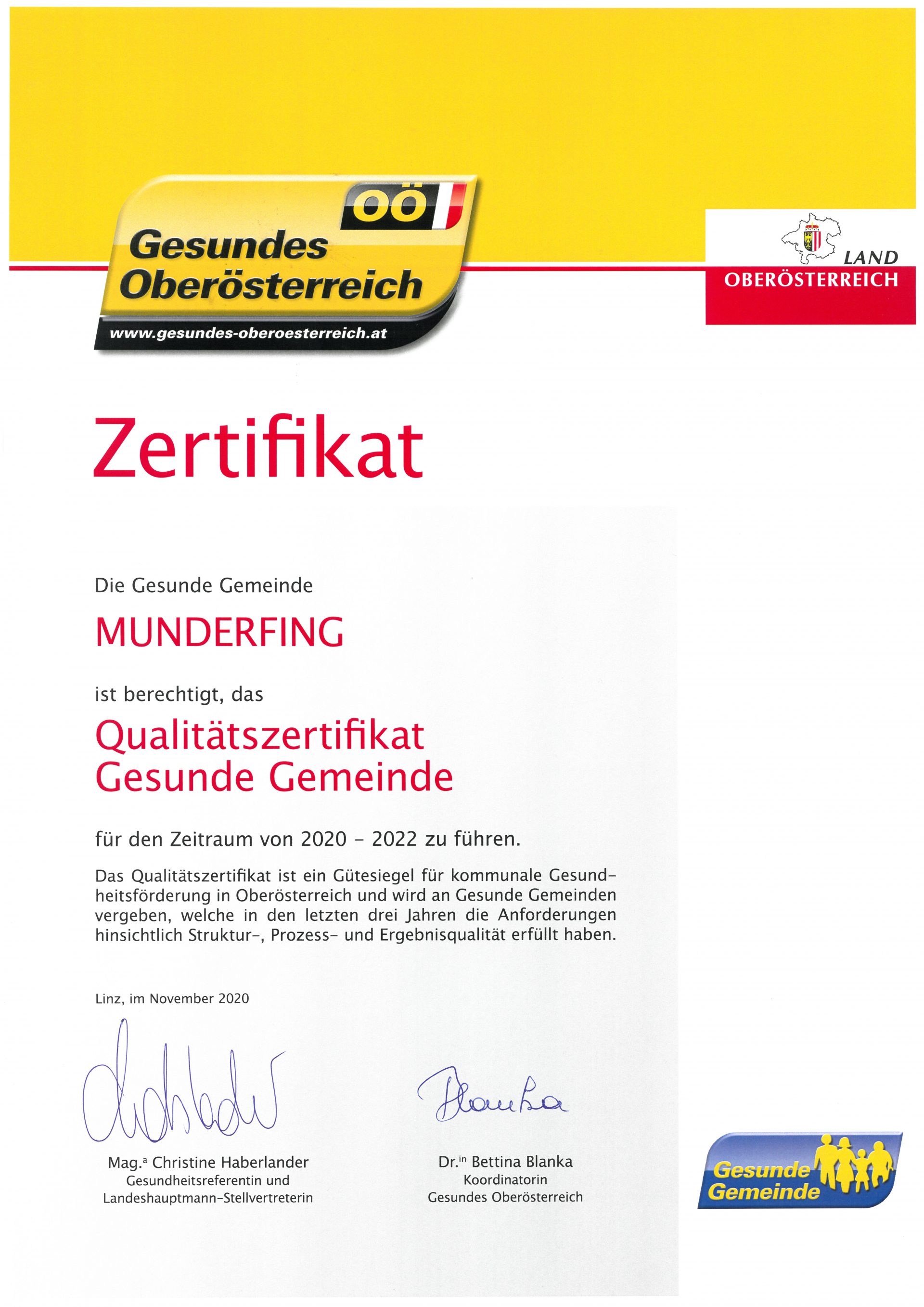 Das Qualitätszertifikat ist ein Gütesiegel für kommunale Gesundheitsförderung in Oberösterreich und wird an Gesunde Gemeinden vergeben, welche in den letzten drei Jahren die Anforderungen hinsichtlich Struktur-, Prozess- und Ergebnisqualität erfüllt haben.