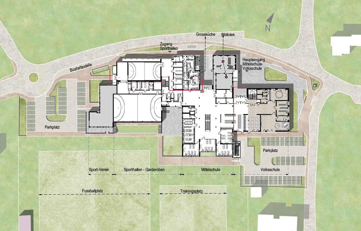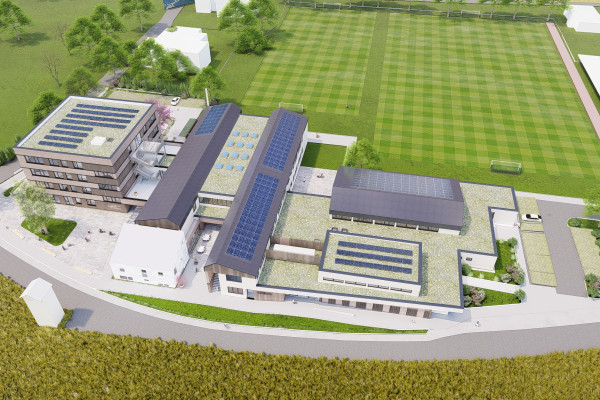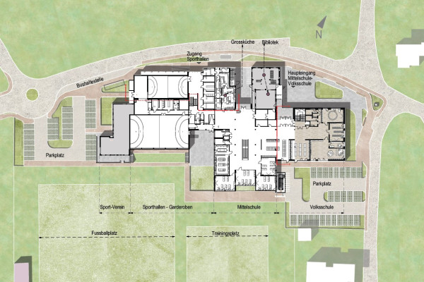 Ein eigener Eingang wird den neuen „Sportcluster“ mit zwei Turnsälen und den Sanitärräumen auch für Vereine zukünftig besser erschließen. Der bestehende Trainingsplatz bleibt in kleinerer Form erhalten.