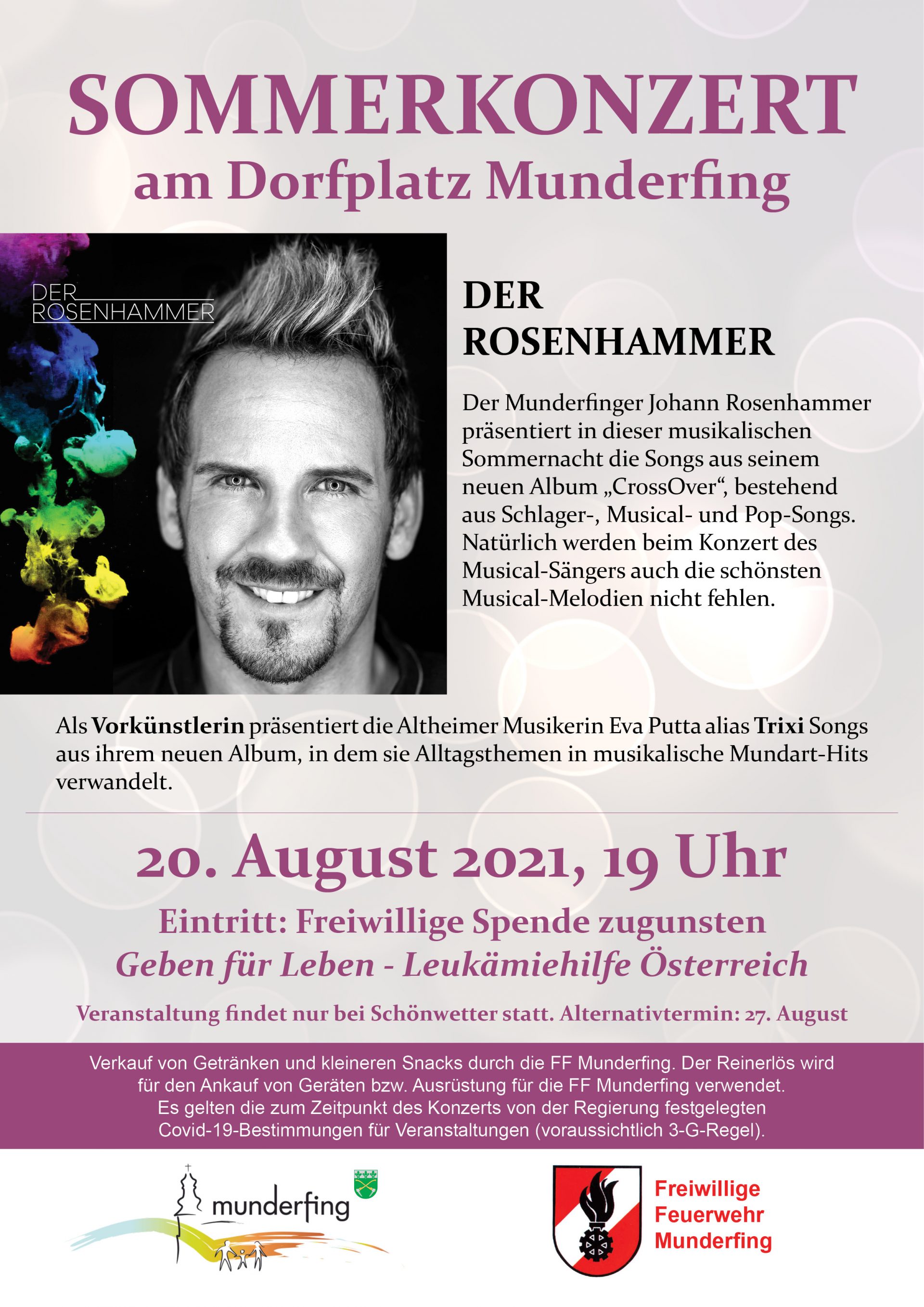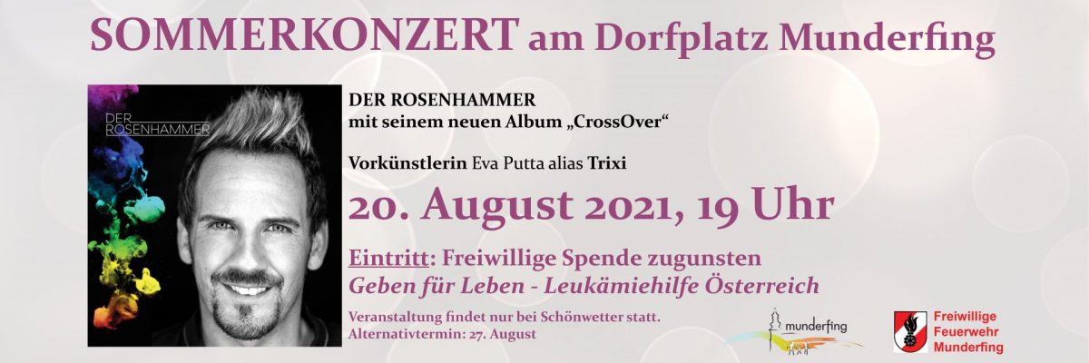 Der Munderfinger Johann Rosenhammer („Der Rosenhammer“) präsentiert in dieser musikalischen Sommernacht die Songs aus seinem neuen Album „CrossOver“, bestehend aus Schlager-, Musical- und Pop-Songs. Natürlich werden beim Konzert des Musical-Sängers auch die schönsten Musical-Melodien nicht fehlen.
