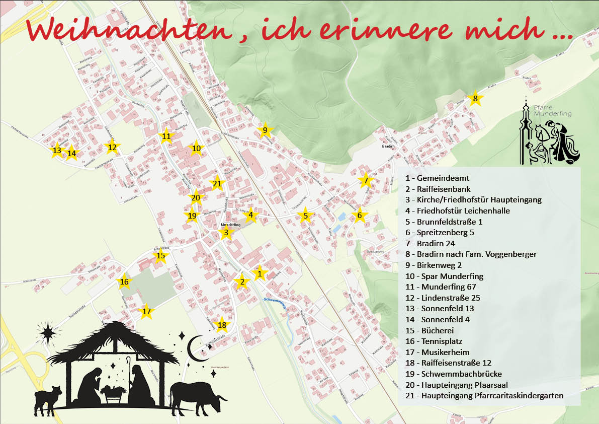 Zwischen Weihnachten und Heilig-Drei-König können bei einem Spaziergang durch Munderfing neue Geschichten und Erinnerungen von verschiedenen Personen entdeckt und gelesen werden.