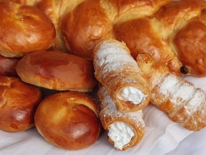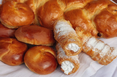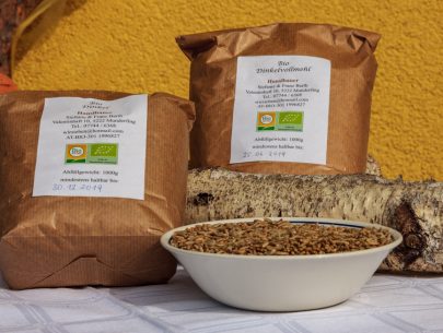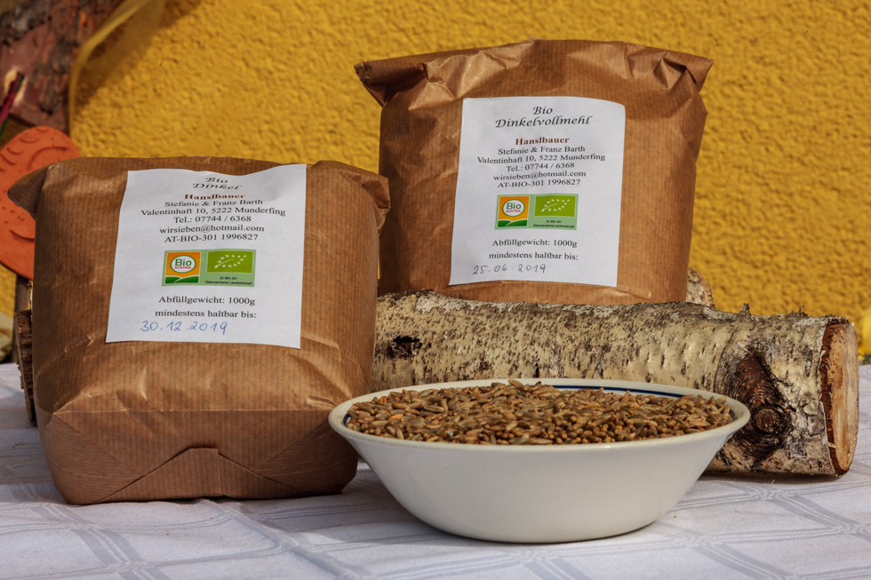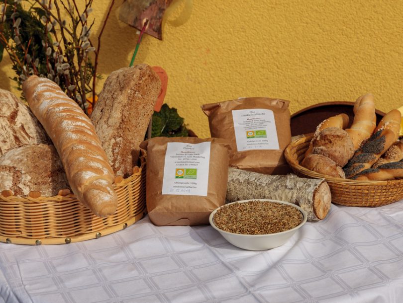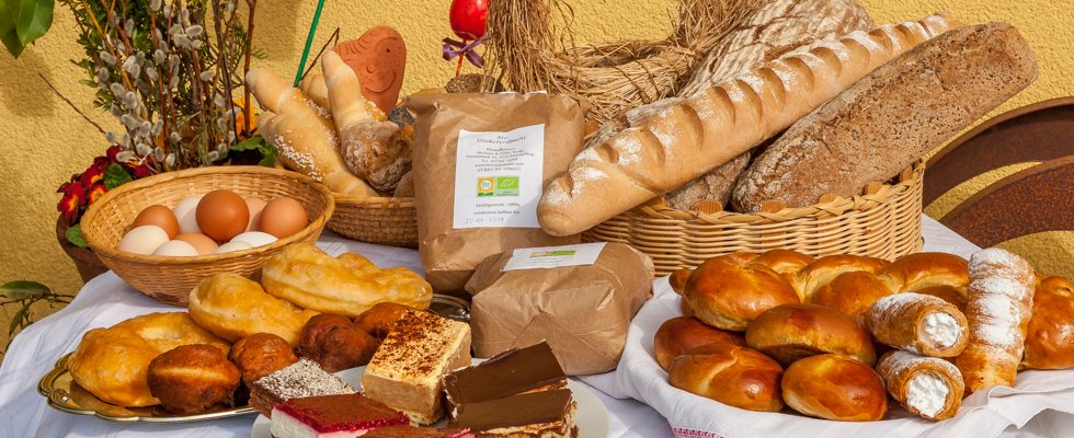 Brot, Gebäck, Kuchen, Torten und Strudel aus Dinkelmehl, Schmalzgebäck, saisonal auch Kekse und Brauchtumsgebäck, Eier, Dinkelfein- und Dinkelvollmehl
