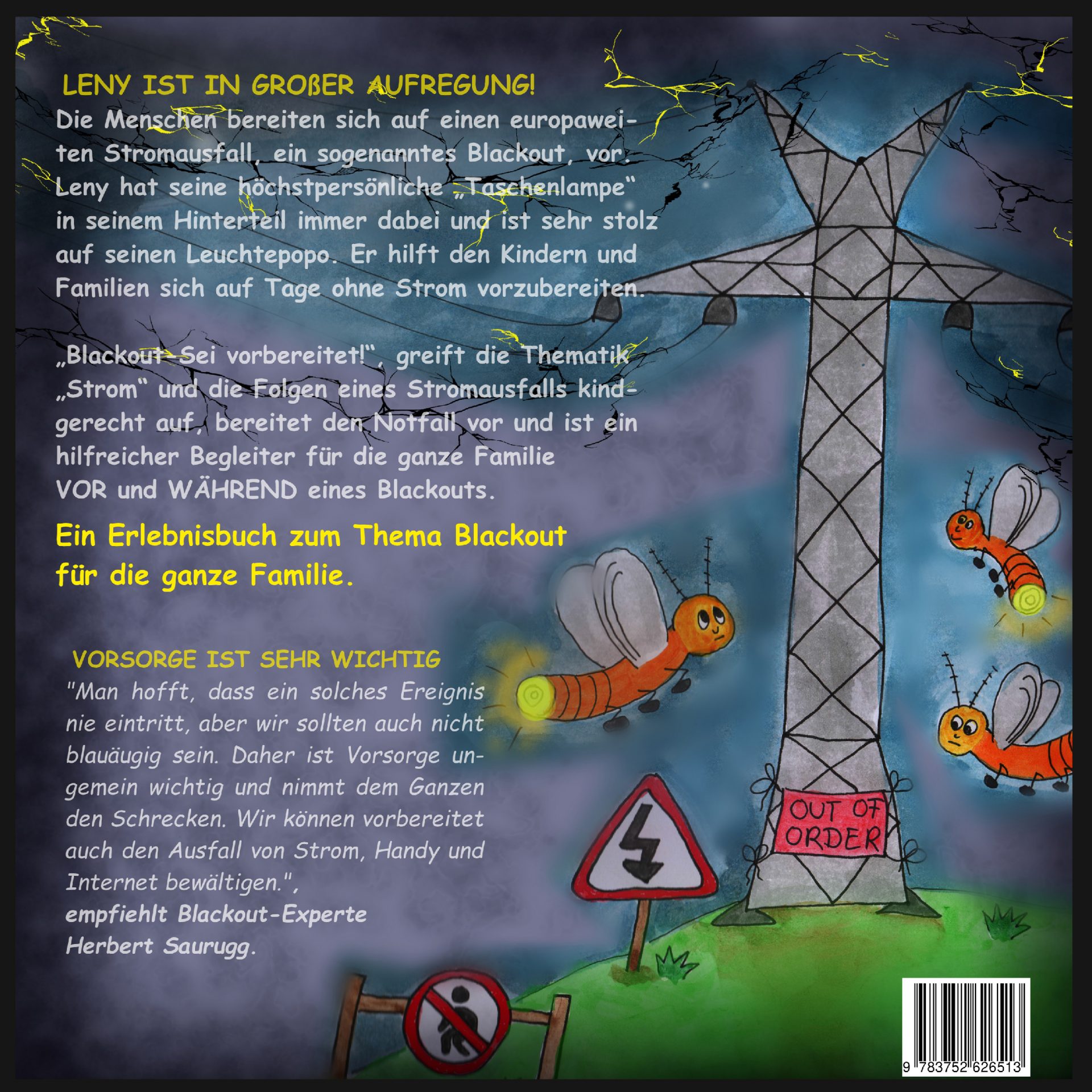 In dem kindgerecht gestalteten Familienbuch ab 6 Jahren informiert ein kleiner Leuchtkäfer, namens Leny über elektrische Energie. Da sein Popo immer leuchtet, ist er auch für den Fall eines Blackouts gut gewappnet und gibt Tipps, wie sich die Leser/innen ebenfalls auf so ein Szenario vorbereiten können. Die erste Hälfte des Buches widmet sich der Vorbereitung auf ein Blackout, die zweite Hälfte unterstützt die Familie während eines längeren Stromausfalls. Leny führt mit informativen Mitmach-Angeboten durch das 62-seitige Buch und lockert dieThematik zwischendurch mit etlichen Leuchtkäferwitzen auf.