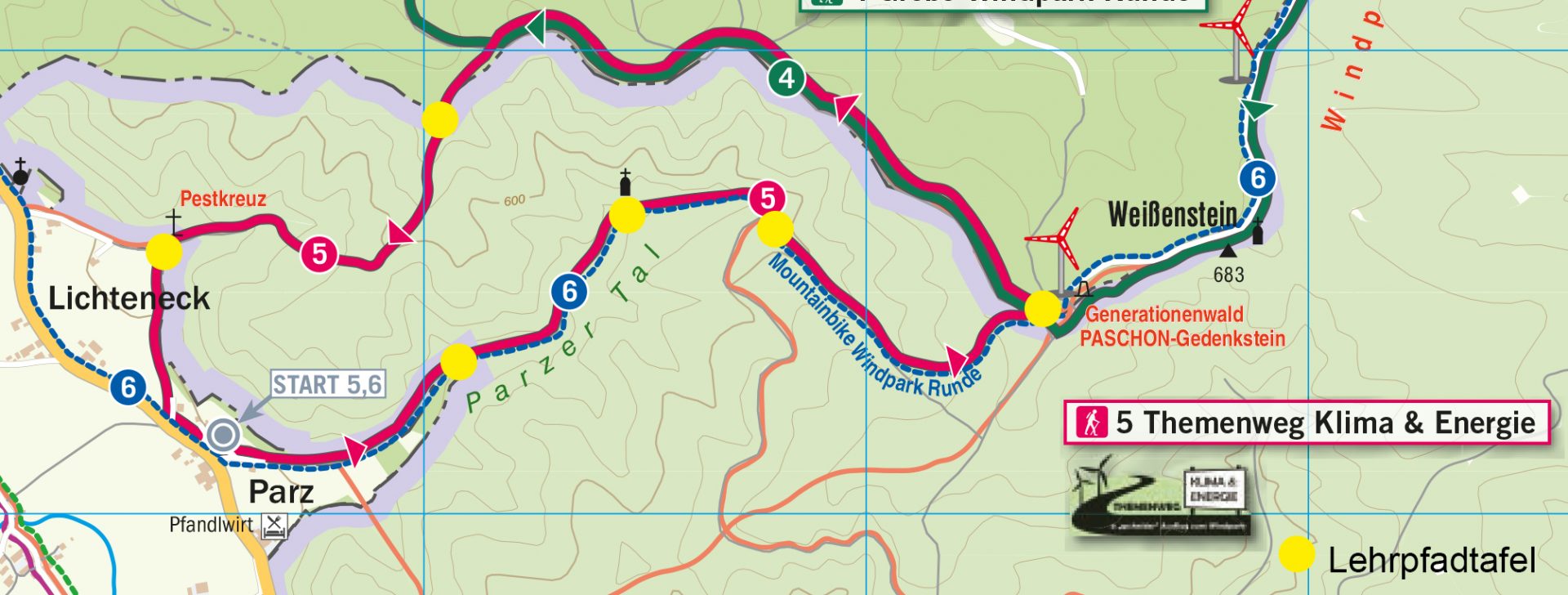 Das Warum und Wieso für den Einsatz erneuerbarer Energie sowie die allgemeinen Grundlagen des Klimas inklusive des Klimawandels wurde mittels eines Lehrpfads verständlich und informativ aufbereitet. Dieser Lehrpfad führt entlang der Strecke von Parz zum Windpark und bietet einen Überblick über die derzeitige Situation der Energiepotentiale und der verfügbaren Technologien im Bereich erneuerbare Energien.